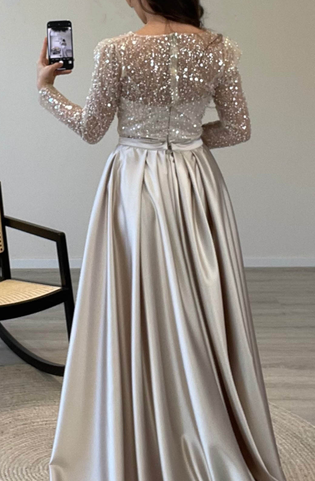 Sparkly Round Neck Sequined Long Sleeves Satin Prom Dresses