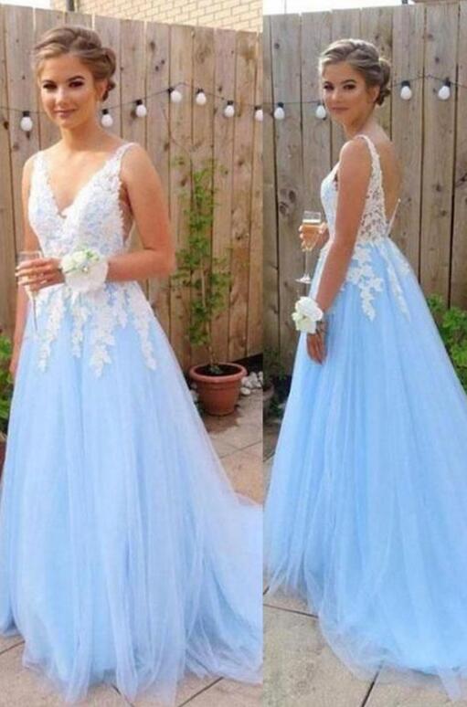 2019 V Neck Tulle Long Light Blue Prom Dress With Applique