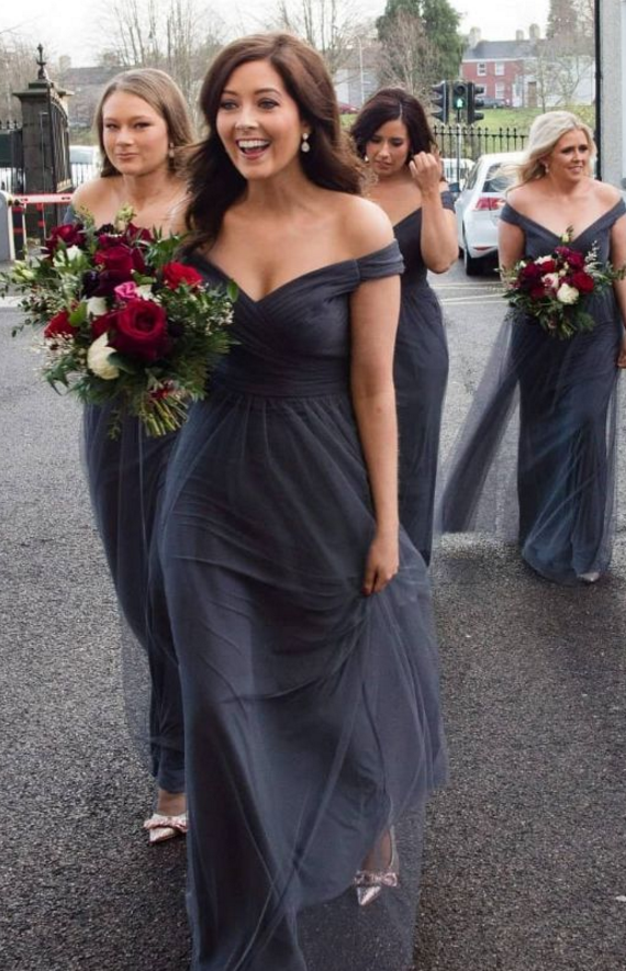 Simple Off the Shoulder Grey Tulle Cheap Bridesmaid Dresses