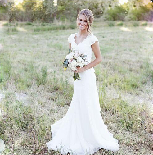 A Line Cap Sleeves Lace Wedding Dress with Buttons Back