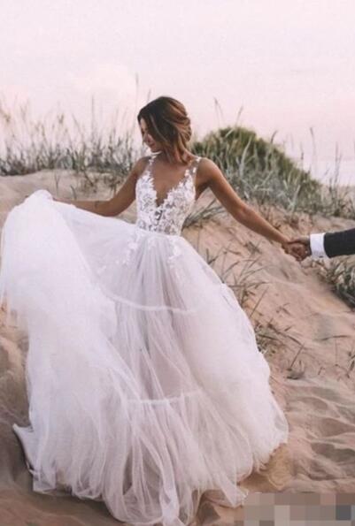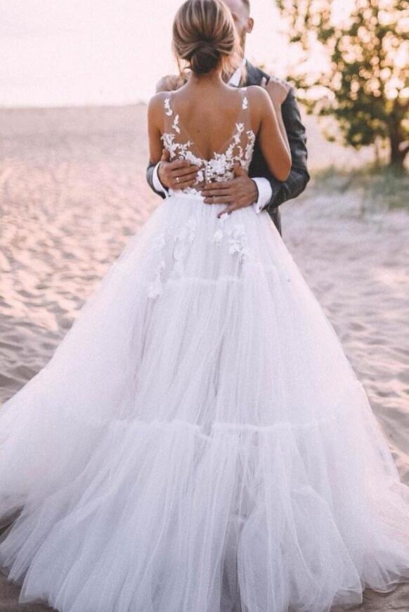 Beautiful Floral Lace V-neck Outdoor Tulle Wedding Dress