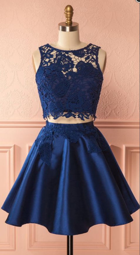 Two Pieces Navy Blue Satin Homecoming Dresses