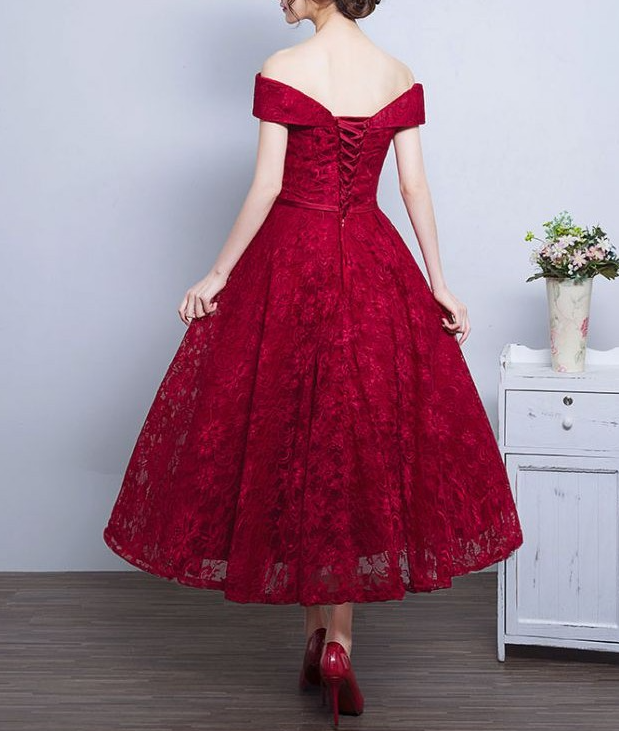 Tea Length Red Off The Shoulder Lace Homecoming Dress