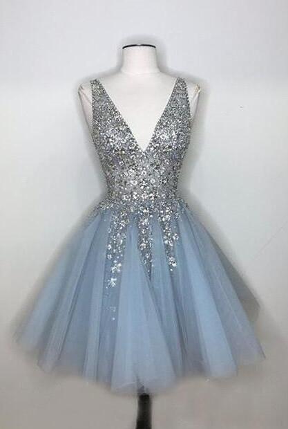Deep V-neck Light Blue Short Homecoming Dresses