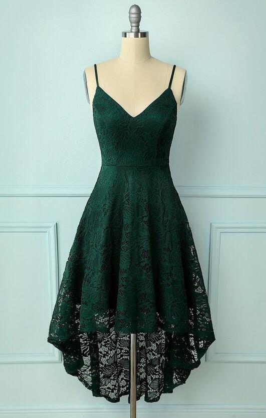 High low Dark Green Straps Lace Prom Dress