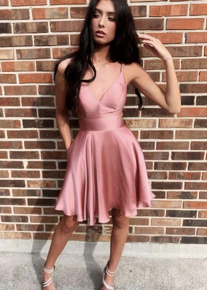 Spaghetti Straps Blush Satin V Neck Short Homecoming Dresses with Pockets