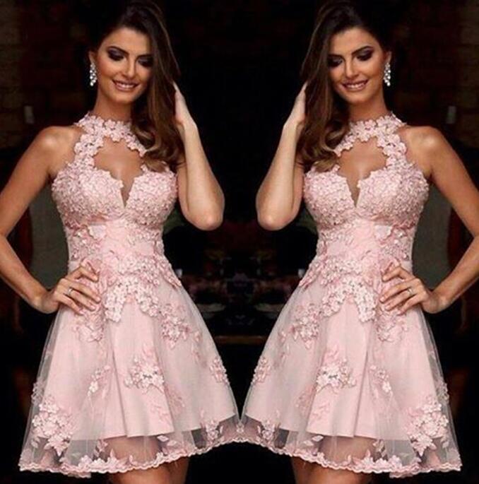 Halter A-Line Tulle Pink Short Homecoming Dresses