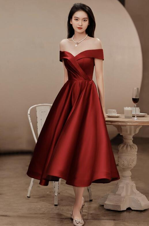 Elegant Simple Dark Red Tea Length Satin Prom Dresses