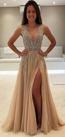 Charming A-Line Split-Front V-Neck Beading Long Prom Dress