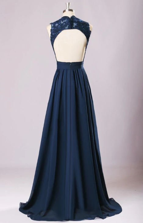 Elegant A Line Navy Blue Chiffon Backless Prom Dresses,Formal Dress