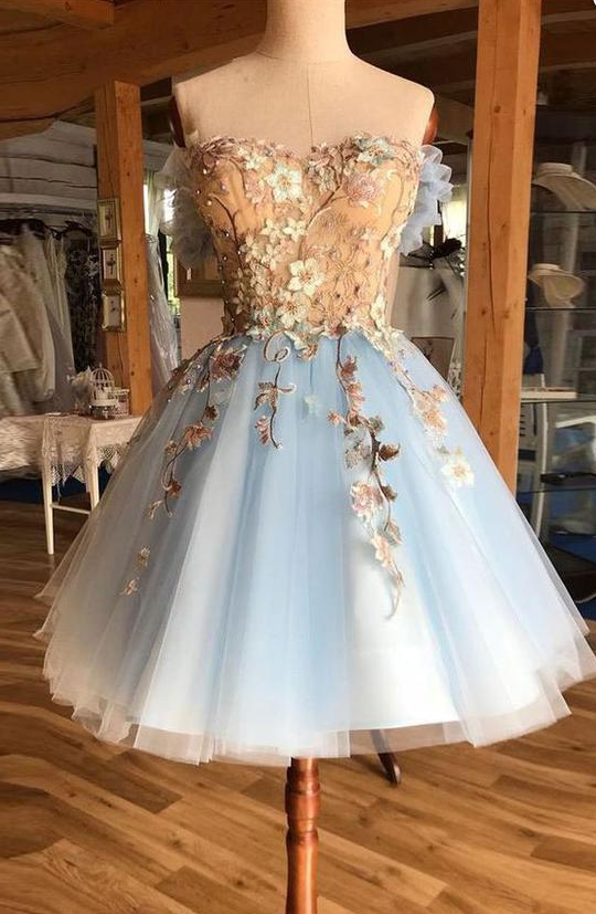 Off Shoulder Cute Above-Knee Light Blue Homecoming Prom Dress with Appliques