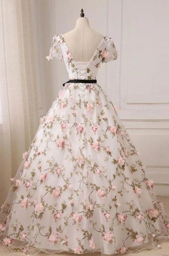 A Line V Neck Pink 3D Flower Long Prom Dress ,Formal Dress