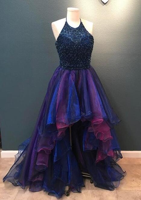 Halter Neck Organza Prom Dresses,High Low Tulle Evening Dress