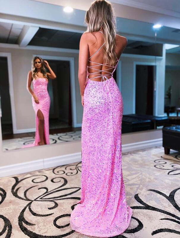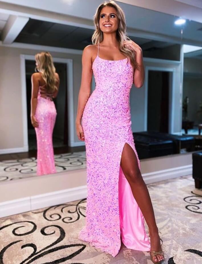 A Line Sparkly Straps Pink Long Prom Dresses with Slit