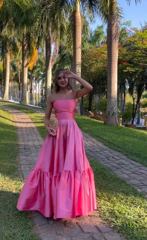 Classy Floor Length Ball Gown Strapless Pink Satin Slit Prom Dresses
