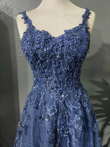 Floor Length A Line Blue Tulle Prom Dress With Lace Applique