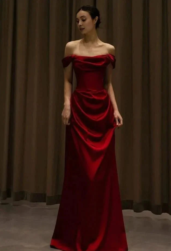 Off-Shoulder Wine Red Stain Formal Evening Dresses