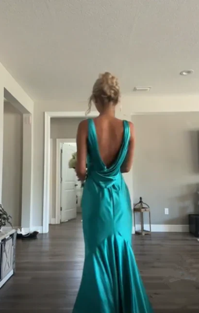 Charming A line V Neck Blue Satin Sleeveless Long Prom Dresses
