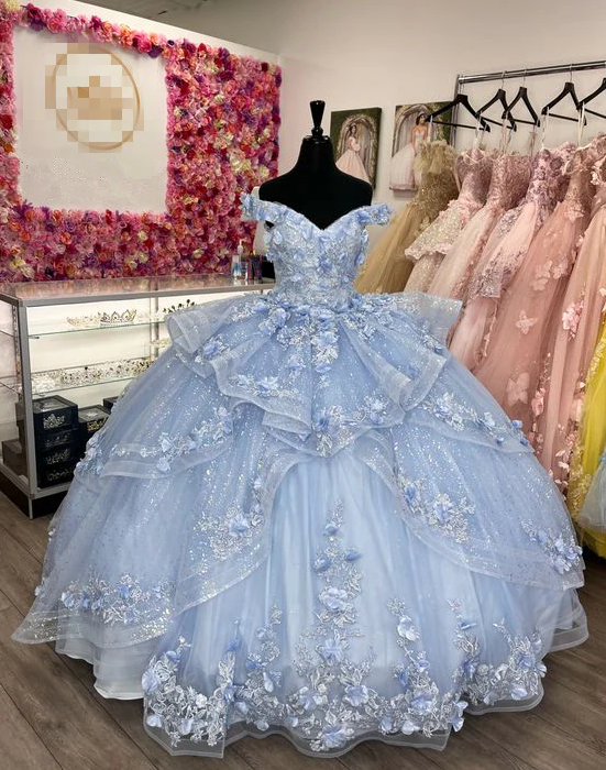 Sparkly Off The Shoulder Light Blue Lace Appliques Prom Dress Quinceañera Dress With Flowers
