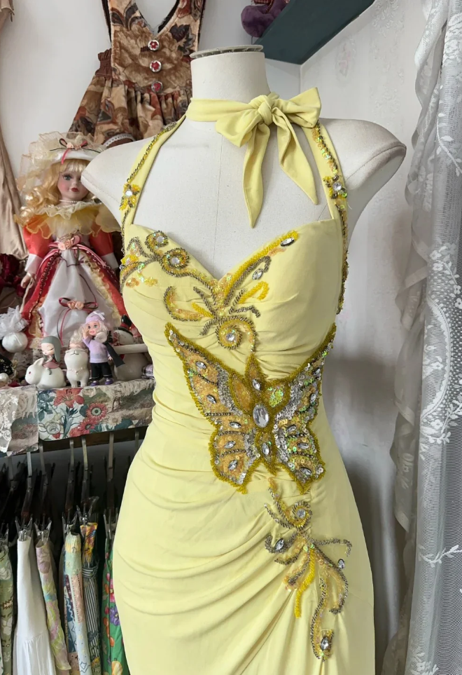 Beautiful Halter Yellow Open Back Long Prom Dress With Beading