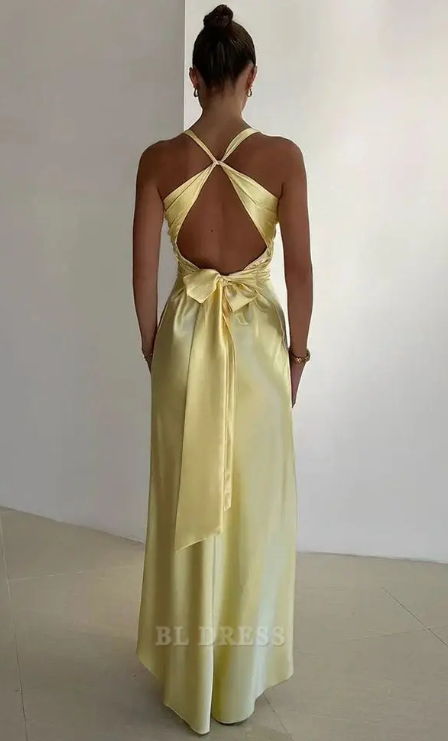 Elegant V Neck Backless Yellow Long Formal Prom Dresses