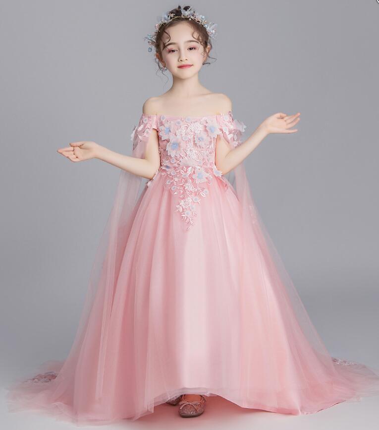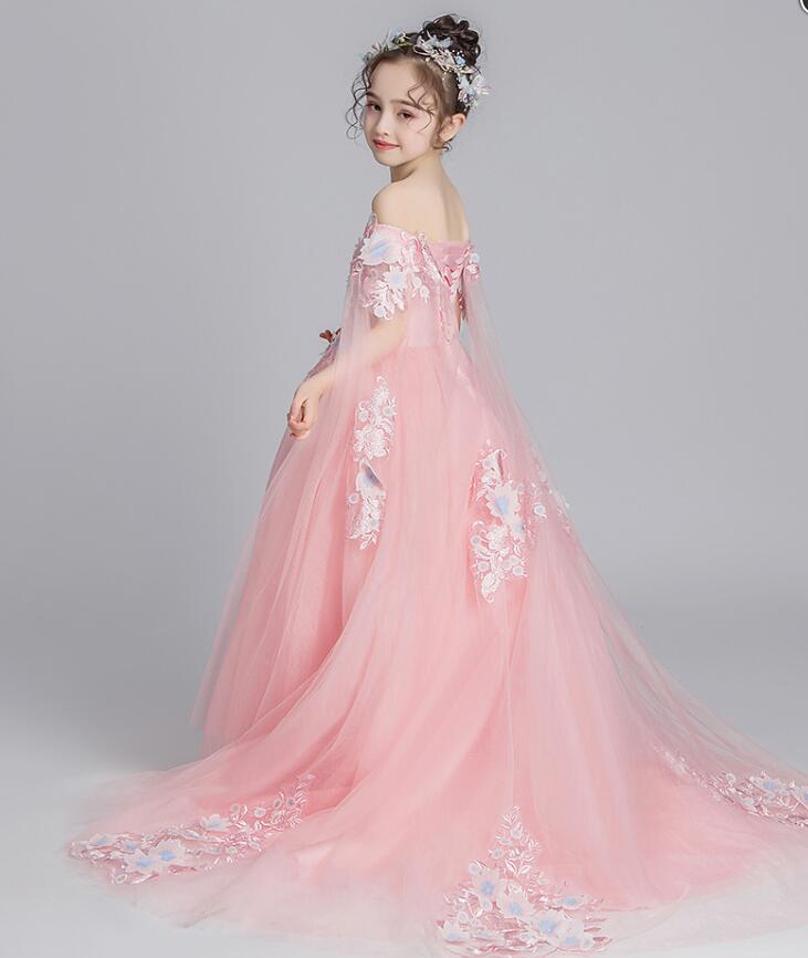Off the Shoulder Princess Floral Pink Flower Girls Dress