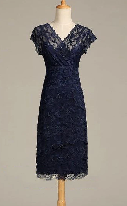 Sheath V Neck Cap Sleeve Navy Blue Lace Midi Mother Dress With V Back