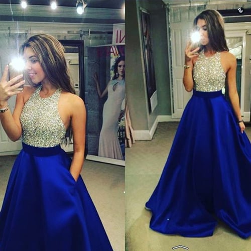Halter beading sleeveless bodice satin pocket beall gown prom dress,evening dresses