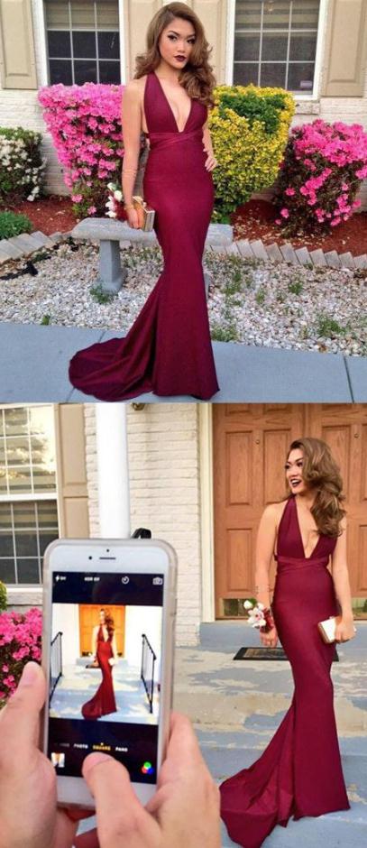 V-neck Sweep Train burgundy mermaid long evening dresses,formal dresses