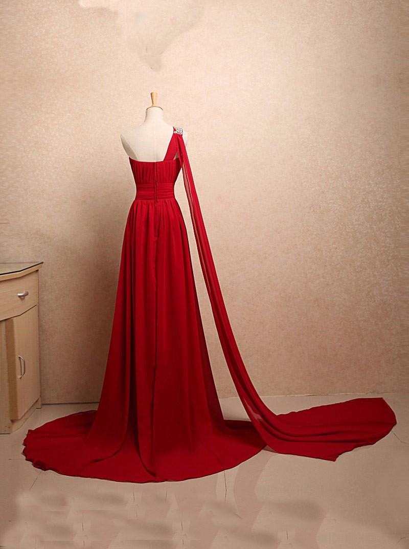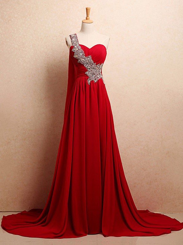 One-shoulder sweetheart beading sweep train long mermaid prom dress red evening dress