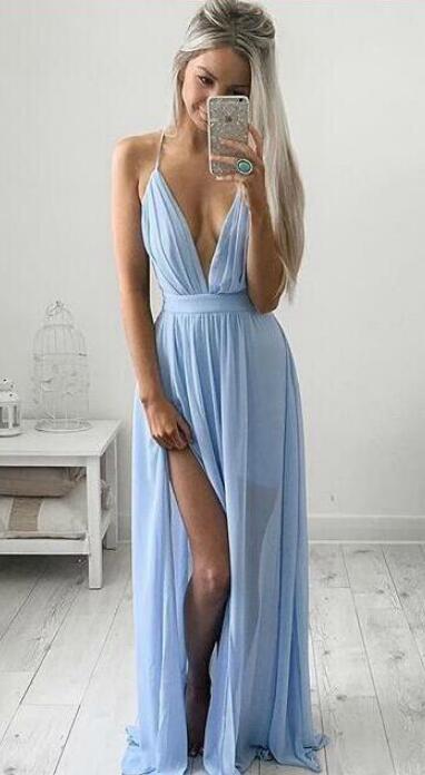 V neck Simple A-line chiffon backless long blue prom dress ,beautiful evening dress