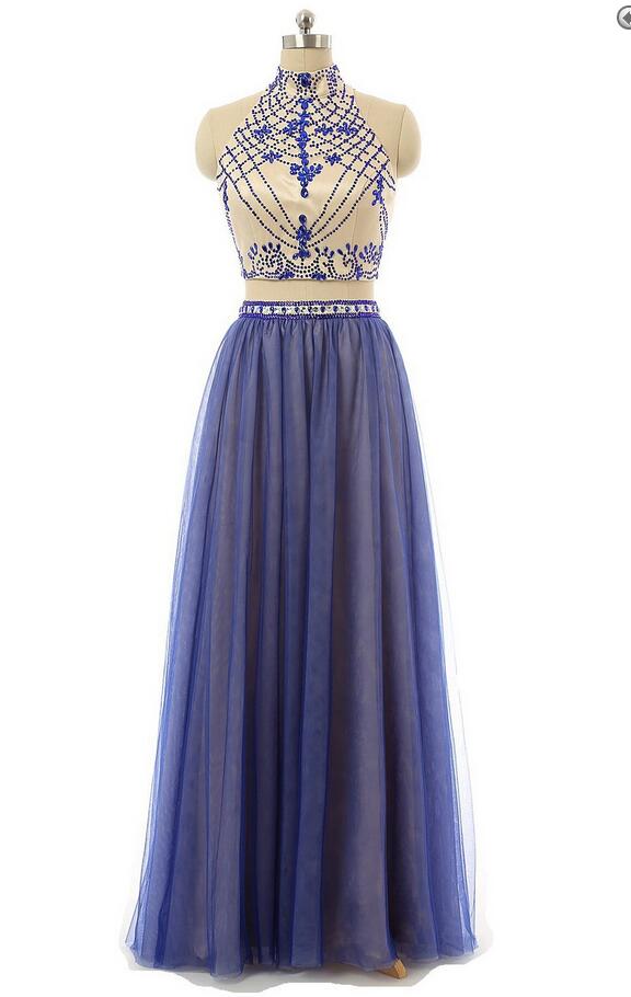 Sexy Two pieces A-line High Neck Tulle Backless Long Blue Prom Dress,Evening Gowns,Party dresses