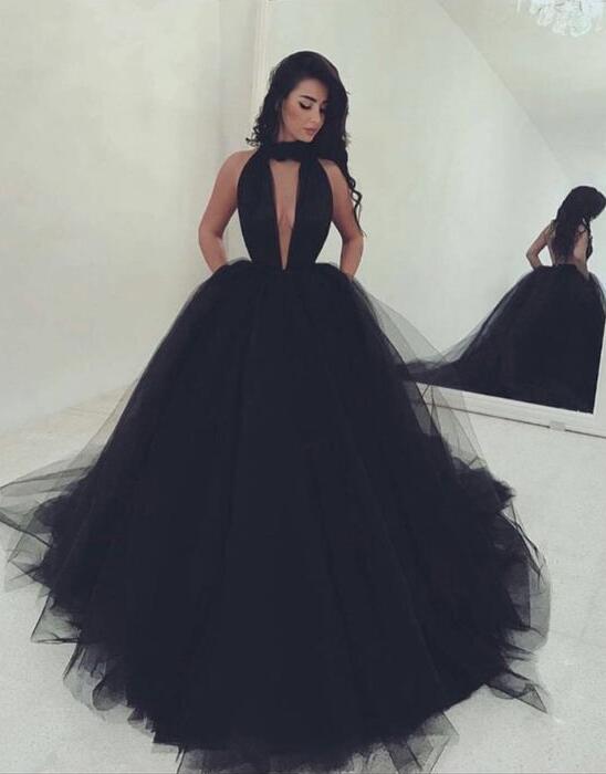 Sexy Key Hole Tulle Black Prom Dress Princess Evening Gown