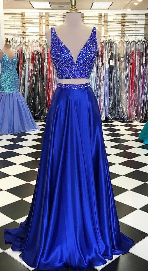 Crystal V Neck Beading Stain Prom Dresses,Long Evening Dresses,Slit Prom Dresses