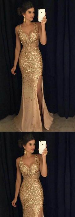 Sexy Beading Gold Long Prom Dress, Deep V Neck Evening Dress with beading