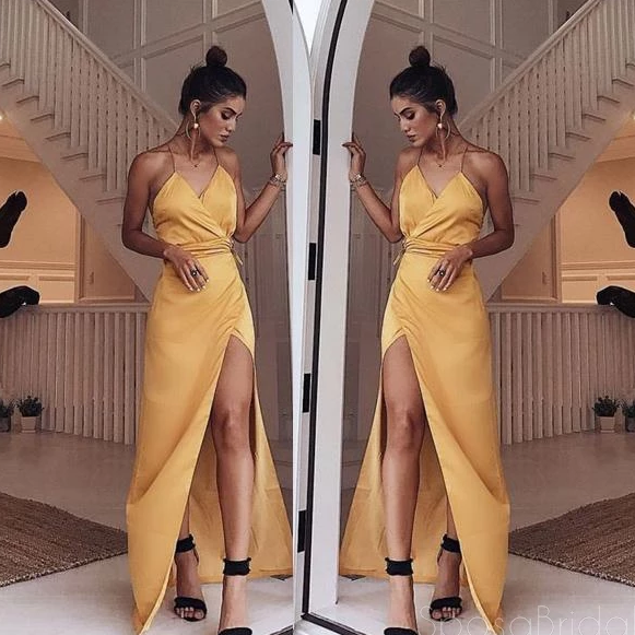 Spaghetti Straps Yellow Long Prom Dresses ,Sexy V Neck Prom Dress with Side Split