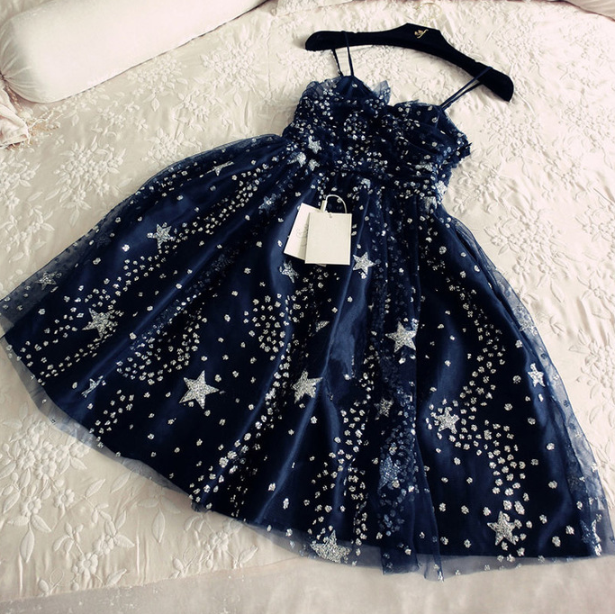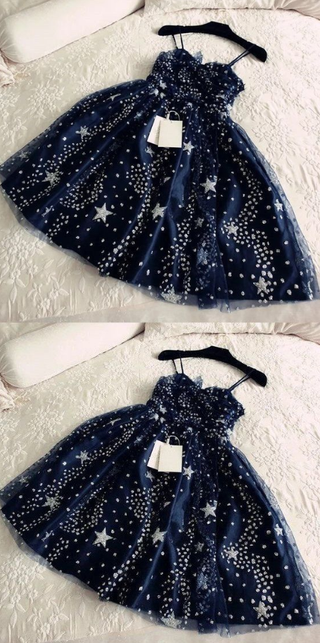 spaghetti-straps blue sleeveless short school event dress ,beaded homecoming dress
