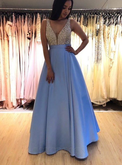Floor-Length V-neck Sleeveless Blue Prom Dress with Beading