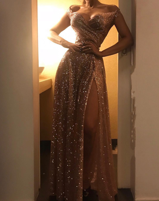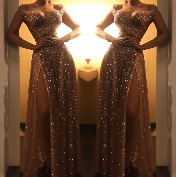 Off-the-Shoulder Sparkly Gold Sequin Long Prom Dresses