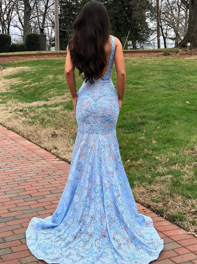 Gorgeous Mermaid Blue Lace Prom Dress,Sexy Evening Dress