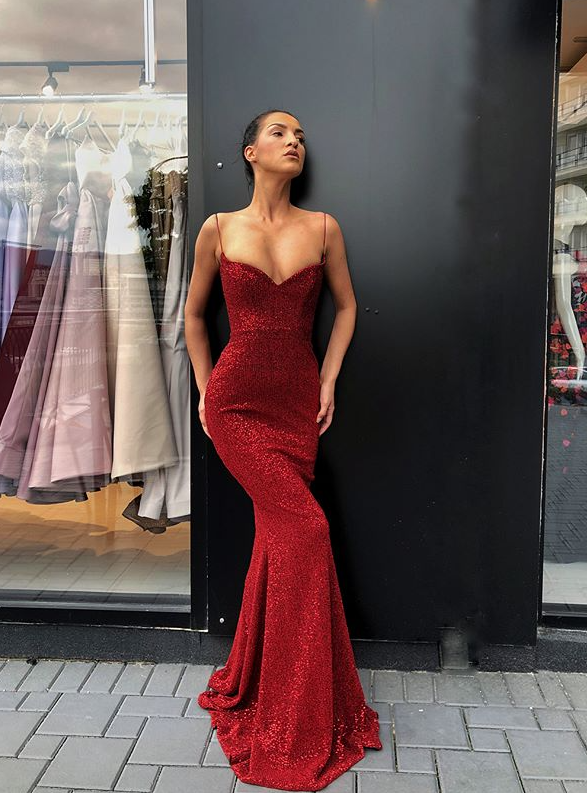 Dark Red Sequins Long Prom Dress,Mermaid Evening Party Dress