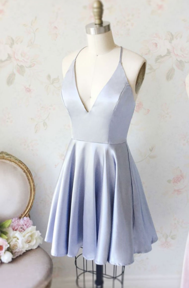 Spaghetti Straps V Neck Silver Homecoming Dress, Graduation Dress