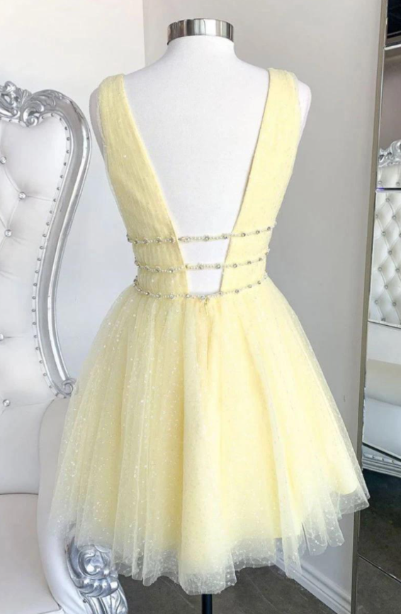 V Neck Yellow Prom Dresses , Short Homecoming Dresses