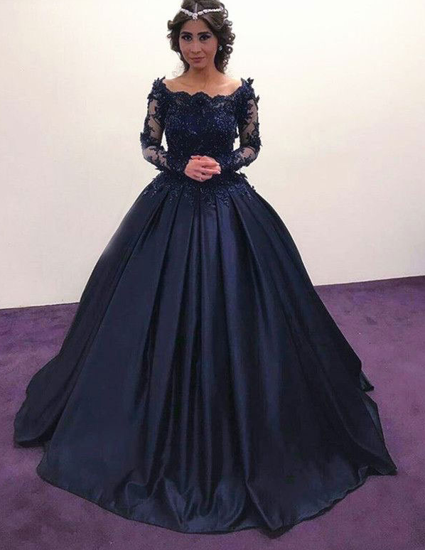 Navy Blue Ball Gown Prom Dresses with Long Sleeves