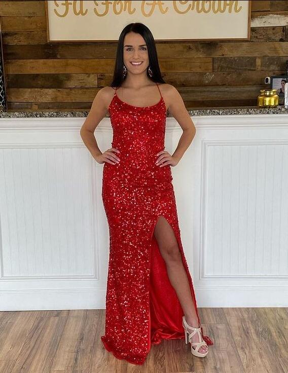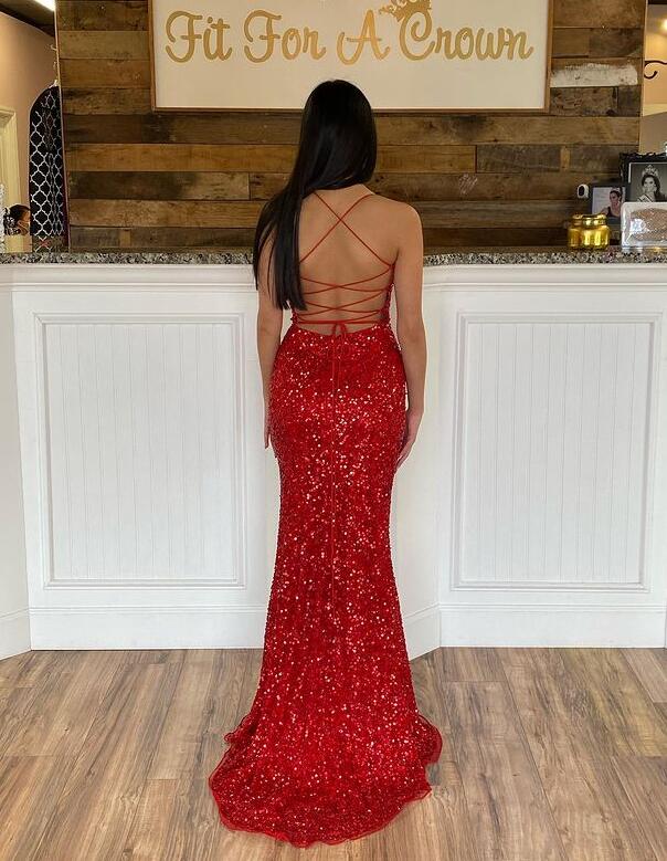 Sparkly Mermaid Cross Back Sequins Split Prom Dresses for Party