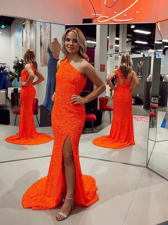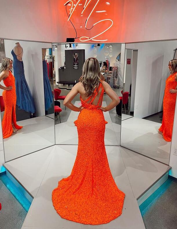 Sexy Mermaid Orange Sequins Prom Evening Dress with Slit