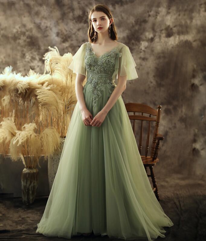 A Line Green Lace Prom Dress with Short Puffy Sleeve Appliques