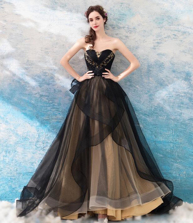 Princess Ball Gown Black and Champagne Sweetheart Long Prom Dresses