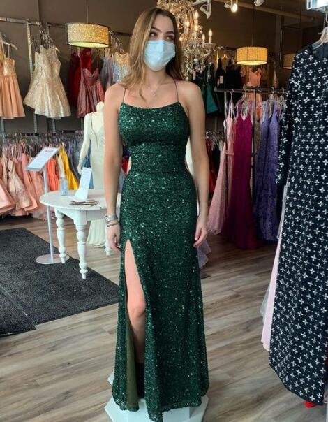 Sheath Scoop Neck Dark Green Sequins Split Evening Dress