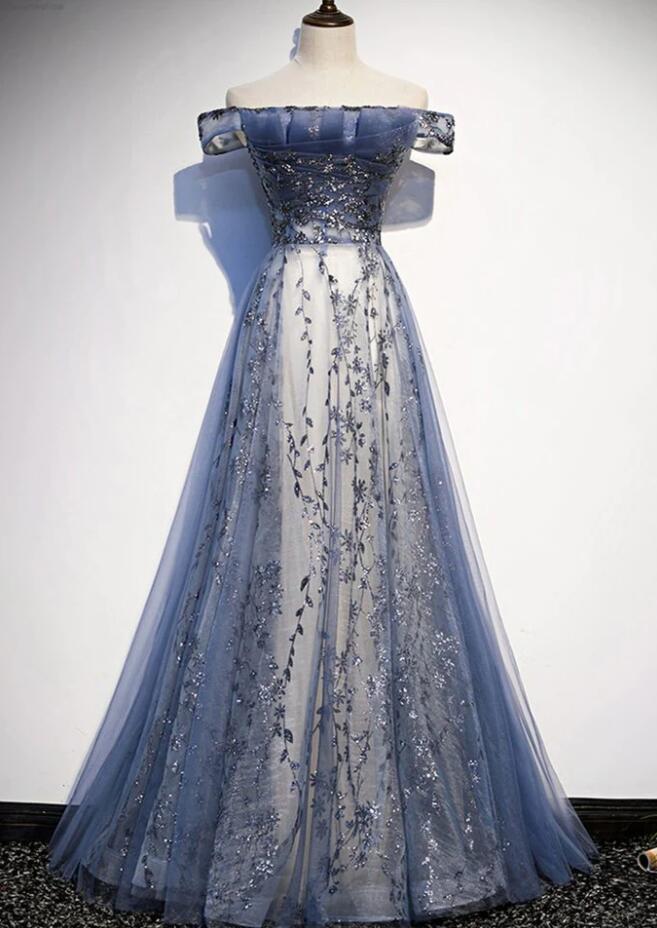 Off Shoulder A Line Stunning Blue Tulle Long Prom Dress